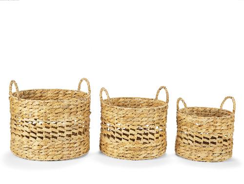 Ver todos los detallesSet de 3 cestas de jacinto de agua, una fibra vegetal muy flexible y utilizada en la fabricación de accesorios de decoración. Este set está compue...