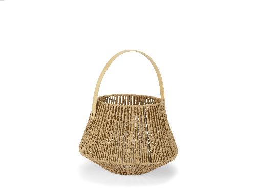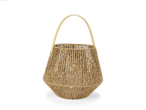 Este portavelas o farol está hecho con cuerda de papel, tiene una estructura de metal y un asa de bambú. Incluye un recipiente de vidrio para coloc...
