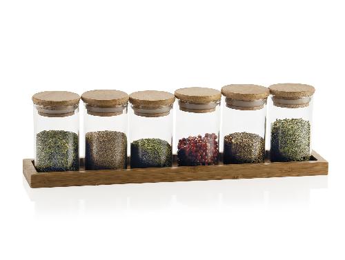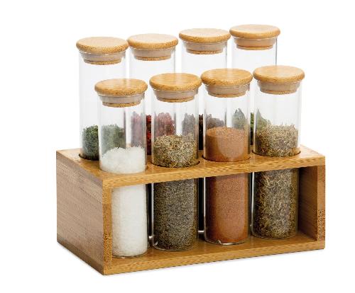 Ver todos los detallesEspeciero de cocina moderno y original compuesto por un soporte de madera de bambú y 8 botes de cristal transparente con forma de tubo y con tapa d...