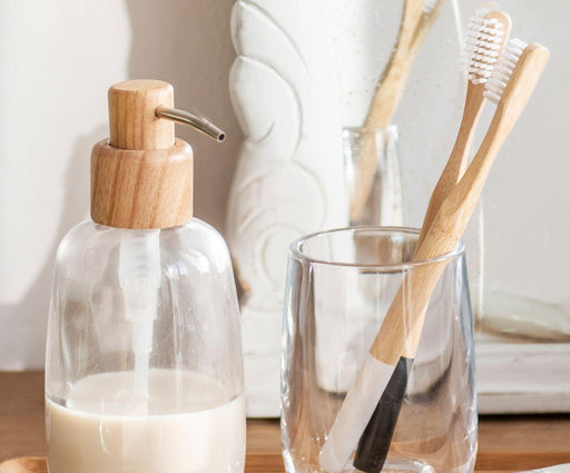 Dosificador para jabón de poliresina con válvula de madera de fresno. Diseñado por Andrea House. Medidas:8x17 cm.