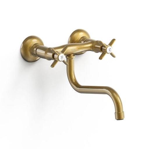 Grifo bimando mural para cocina de la colección COCINA de Grifería Tres.Con caño superior. Distancia a pared: 273 mm.Color: Latón Viejo Mate.Colecc...