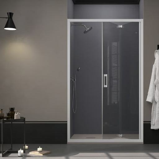 Ver todos los detallesMampara para plato de ducha de la serie NIXON de Bathme compuesta por dos hojas fijas y dos puertas correderas con apertura desde el vértice. Perf...