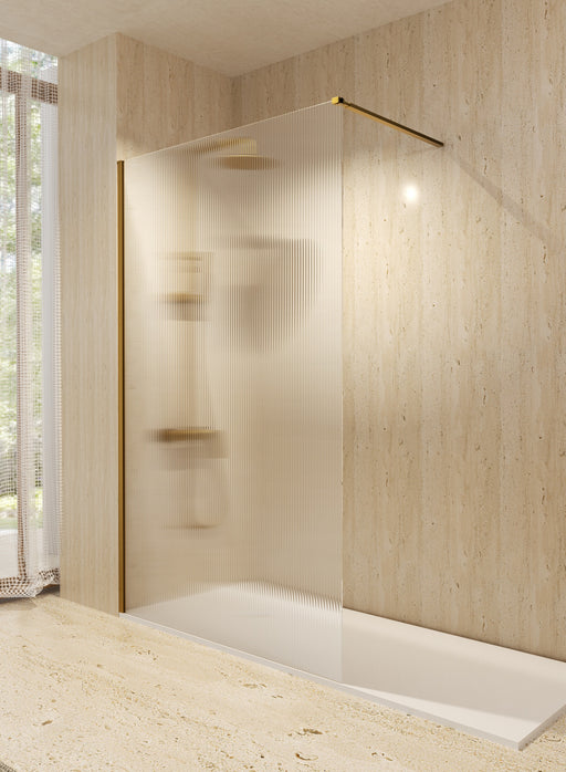 Ver todos los detallesMampara de ducha frontal transparente con perfilería minimalista de aluminio oro de tan solo 20mm. Cristales templados de 6mm con tratamiento antic...
