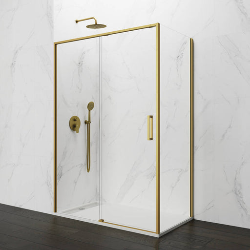 Ver todos los detallesMampara de ducha angular transparente compuesta por frontal fijo más corredera y lateral fijo de 6mm con perfilería minimalista de aluminio oro de ...