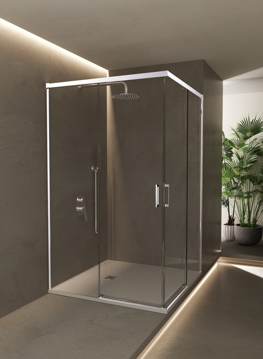 Ver todos los detallesMampara para plato de ducha rectangular de la serie NIXON de Bathme compuesta por dos hojas fijas y dos puertas correderas con apertura desde el vé...