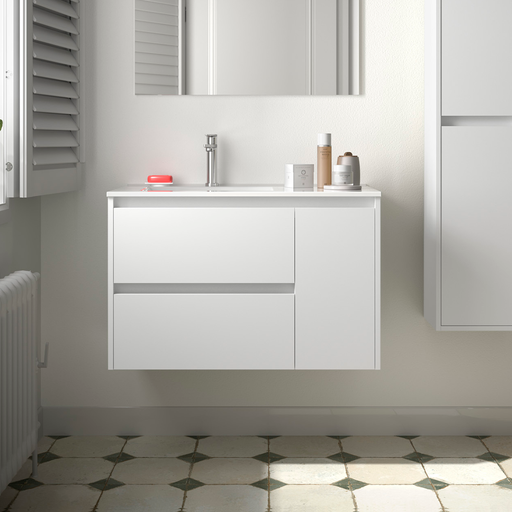 Ver todos los detallesMueble de baño ATTILA de Salgar destaca por su característico tirador en negro mate. Mueble suspendido con dos cajones y lavabo de porcelana blanca...