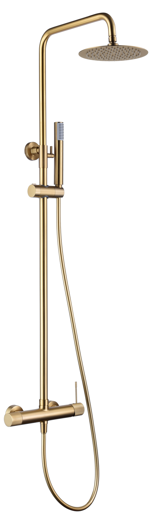 Ver todos los detallesGrifería de ducha termostática con equipo de ducha y soporte color oro cepillado de la serie LINE de Imex. Grifería termostática de ducha de lató...