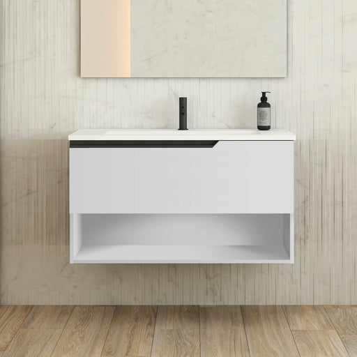 Ver todos los detallesMueble de baño suspendido con dos cajones y una puerta de la serie BOX de Visobath. Acabado lacado blanco nieve brillo. Pack mueble+lavabo: Mueb...