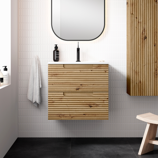 Ver todos los detallesMueble de baño suspendido con dos cajones y elegante tirador acabado madera de la serie ARCO de Visobath. La serie ARCO es una serie con mucho cará...