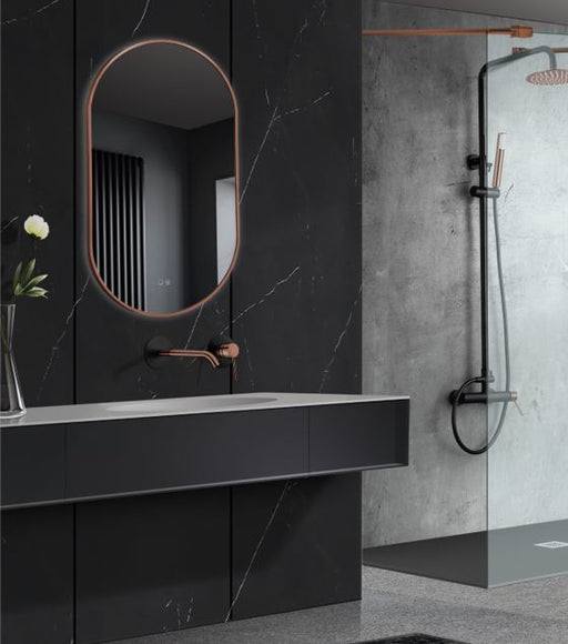 Elliptical mirror from the TOKYO series made by LEDIMEX. Elliptical-shaped mirror in rose gold color. Measurements: 50x90cm. Type of LED light: B...
