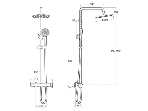 See all the detailsSingle-handle shower column with adjustable height. Includes ø250 mm sprayer, ø110 mm hand shower with 3 functions, 1.5 m metal hose, and height-ad...