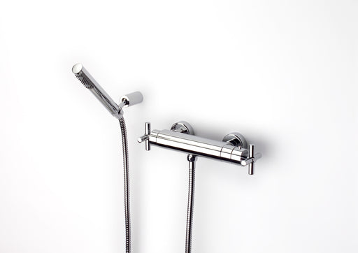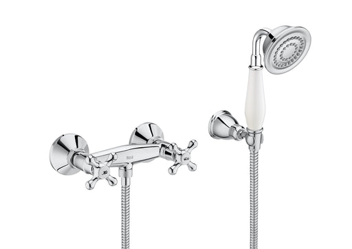 See all the detailsExterior two-handle mixer for shower with handheld shower, 1.50 m flexible hose, and articulated support. CARMEN is a tribute to one of the most ic...