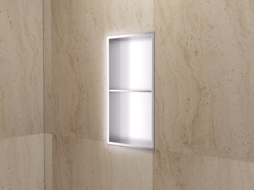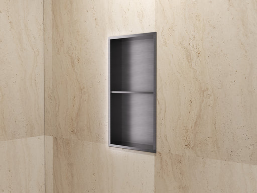 See all the detailsHORNACINA vertical de 33x63cm, de dos estantes con luz led. Acabado NIQUEL CEPILLADO Profundidad 10 cm. Fabricada en acero inox. S.304 Disponi...