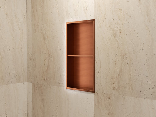 See all the detailsHornacina vertical de 33x63cm, con dos estantes. Acabado ORO ROSA CEPILLADO Profundidad 10 cm. Fabricada en acero inox. S.304 Disponible en 6...