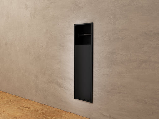 See all the detailsHORNACINA Vertical de 17x60cm, para escobillero empotrado y portarrollos Acabado NEGRO MATE Profundidad 10 cm. Fabricada en acero inox. S.304 Dis...