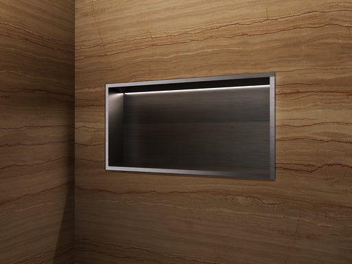 See all the detailsHORNACINA horizontal de 63x33 cm con luz led en el fondo superior Acabado BLACK GUN METAL Profundidad 10 cm. Fabricada en acero inox. S.304 Disp...