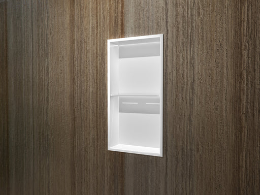 See all the detailsHORNACINA vertical de 33x63cm, de dos estantes con luz led. Acabado BLANCO MATE Profundidad 10 cm. Fabricada en acero inox. S.304 Disponible e...