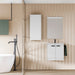 - 50 cm cabinet wide with 2 doors, adjustable white wooden inner shelf and soft-close. Black leather handle.
