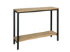 This industrial design console is composed of a black metal frame and two shelves of natural finish wood: the upper one or console surface and another shelf close to the floor.