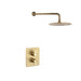 Built-in 1-way thermostatic set with metal wall-mounted Ø250 mm showerhead from the ALEXIA series by Ramon Soler. Brushed gold finish. Includes built-in part.
