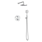 Bathroom-shower thermostatic faucet set T-500 BASIC from Roca Sanitarios. Includes built-in thermostatic mixer for bathroom-shower T-500, circular RainSense Ø200 mm showerhead, L400 mm wall shower arm, Aqua Round intake holder, 1.70 m Neoflex metal hose, and Stella 100/3 hand shower.