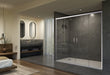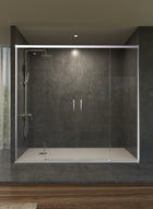 Mampara para frontal de platos de ducha compuesta por dos hojas fijas y dos puertas correderas sin rodamiento en la parte inferior, que facilita la limpieza y accesibilidad. Apertura desde el centro.