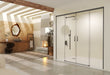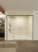 Mampara para frontal de platos de ducha compuesta por dos hojas fijas y dos puertas correderas sin rodamiento en la parte inferior, que facilita la limpieza y accesibilidad. Apertura desde el centro.