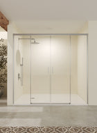 Mampara para frontal de platos de ducha compuesta por dos hojas fijas y dos puertas correderas sin rodamiento en la parte inferior, que facilita la limpieza y accesibilidad. Apertura desde el centro.