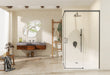 Mampara angular de platos de ducha cuadrados, compuesta por dos hojas fijas a la pared y dos puertas correderas sin rodamiento en la parte inferior, que facilita la limpieza y accesibilidad. Apertura desde el vértice.