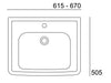 - Sink made of white sanitary porcelain measuring 67x50 cm with 1 hole for the faucet and integrated overflow.