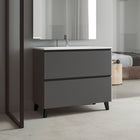 Bathroom furniture with floor feet from the GRANADA series with two drawers of large capacity in an industrial style, with black metal handles with epoxy paint. Manufactured and designed by Visobath in Spain. Made with matte lacquer of the latest generation, very resistant matte ash gray color.