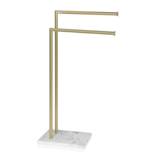 Ver todos los detallesEl toallero de metal dorado con base efecto mármol proporciona dos soportes en forma de tubo, uno más alto para la toalla de ducha y otro más bajo ...