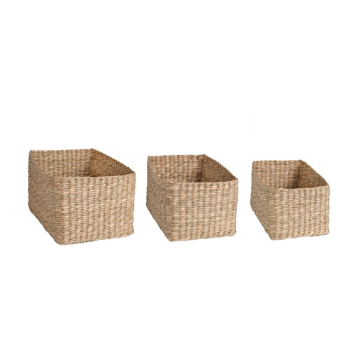 Ver todos los detallesSet de 3 cestas de alga marina, una fibra natural muy versátil y usada en el mundo de la decoración. Se trata de 3 cestas rectangulares y hondas, d...
