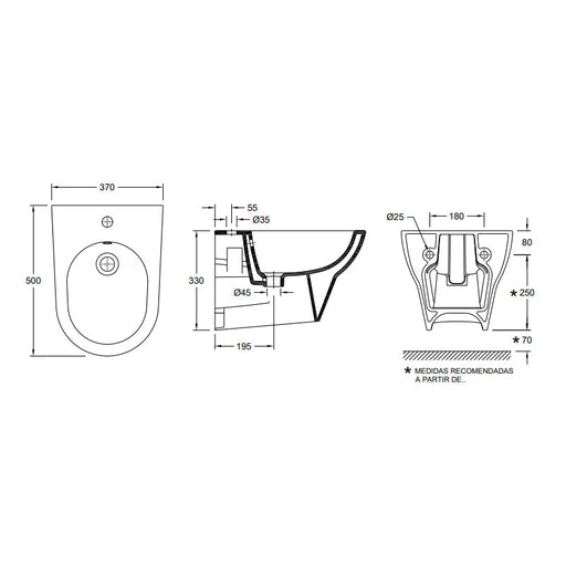 Ver todos los detallesBidé suspendido serie CORAL de Sanitana. Medidas: 555 x 360 x 400 mm. Incluye kit de fijación. No incluye grifería ni válvula de desagüe. C...