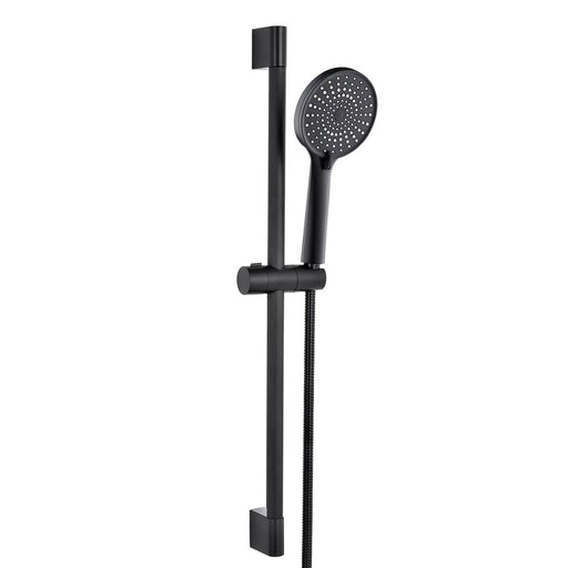 Columna de ducha monomando modelo DAKAR BLACK, 2 vías, regulable en altura de 83 a 120 cm. Incluye flexo, ducha de mano y rociador redondo.
