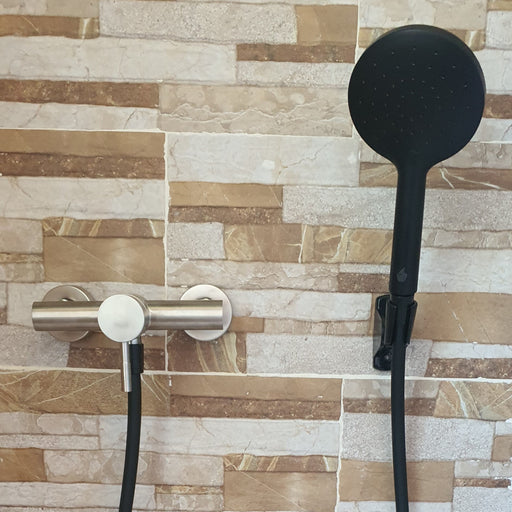 Fabricado en acero inox.  Cartucho de 35mm.Set compuesto de:1 Mango de ducha NEGRO 1P cabezal circular1 Flexo PVC color NEGRO y tuercas de latón. M...