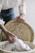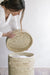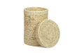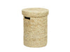 Cesto para ropa sucia confeccionado a base de hoja de palma, con tapa extraíble y asas para facil transporte.