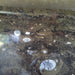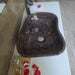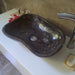 Lavabo sobre encimera de marmol marrón con fósiles marinos prehistóricos incrustados.