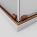 Mampara de ducha angular transparente compuesta por frontal fijo más corredera y lateral fijo de 6mm con perfilería minimalista de aluminio cobre de tan solo 20mm. cristales templados de 6mm con tratamiento antical. Entrega inmediata.