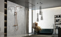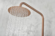 Imex en acabado oro rosa cepillado, barra de ducha extensible, cuerpo de la griferia de latón oro rosa cepillado, rociador extraplano Ø20 y antical, cartucho cerámico de 35mm, incluye flexo PVC y mango.