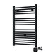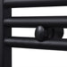 Toallero secatoallas eléctrico NEGRO con termostato eléctrico para el control de la temperatura. Acabado en color negro mate. Con formato de 16 tubos, similar a los de circuito de calefacción estandar. Tubos de acero lacado en negro. Los 600w de potencia tienen una capacidad más que suficiente para secar o calentar las toallas sin disparar el consumo eléctrico de la vivienda. Fácil y rápido montaje. Cable y enchufe incluidos. Botón de encendido y apagado. Ideal para integrarse en un entorno de diseño.