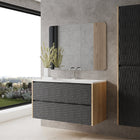 Mueble de baño DUNE de Valman. Combina un diseño moderno y funcional con una estética natural y sofisticada. Su estructura en color arizona añade calidez, mientras que el frontal blanco mate de los cajones, con una textura ondulada única, aporta un toque contemporáneo y suave al espacio. Equipado con dos amplios cajones, ofrece un almacenamiento práctico y cómodo, ideal para mantener organizados los artículos de baño.