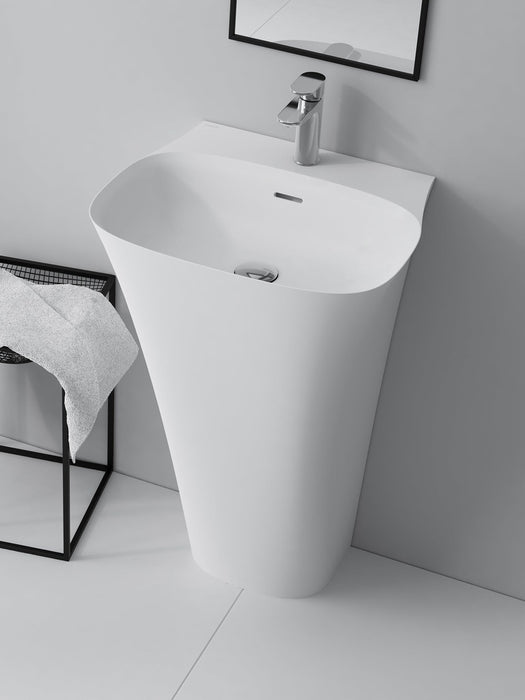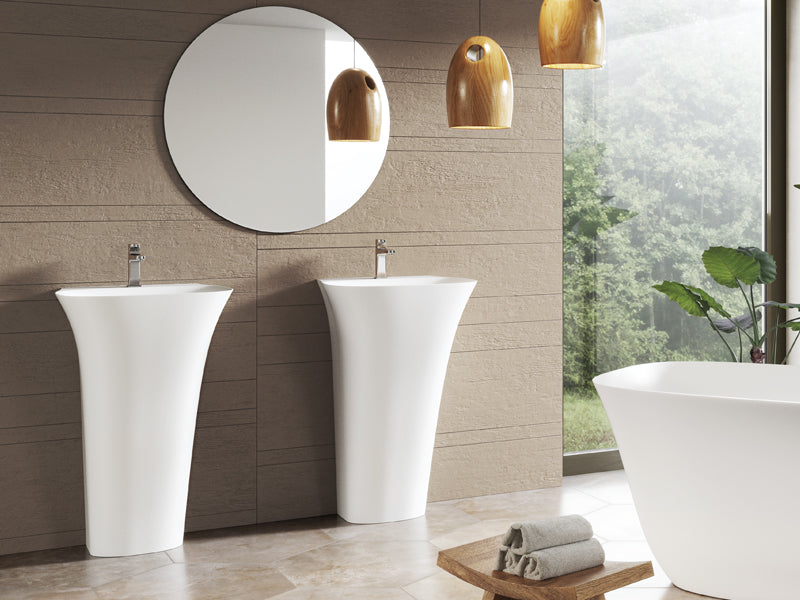 Lavabo a suelo totem LEVI de la colección Acquawhite de Acquabella. Un fragmento del océano convertido en fuente de inspiración. La serie LEVI de la colección Acquawhite se basa en la simplicidad delicada de las suaves formas que evocan las ondas que deja el mar en la costa. Esta selección de bañera, encimera, tótems y lavabos son capaces de recrear la sensación de sosiego que nos produce el movimiento del agua.