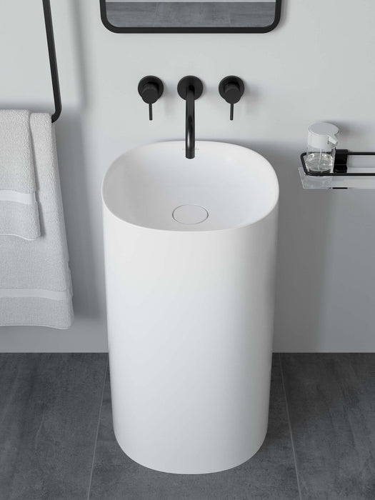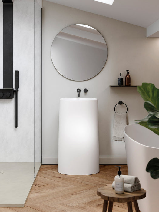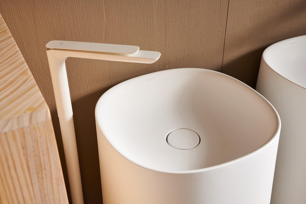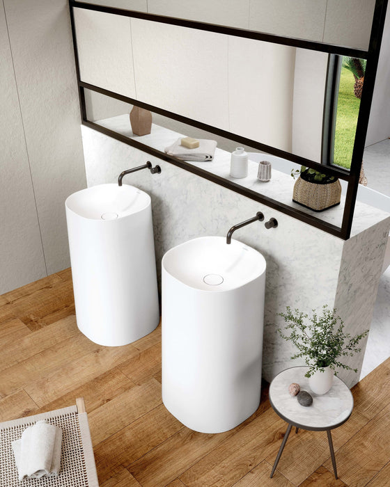 Lavabo a suelo totem VARS de la colección Acquawhite de Acquabella. La pureza de las formas que nos traslada a la calma más absoluta. La serie VARS de la colección Acquawhite se trata de una completa colección de baño cuya versatilidad la convertirán en la principal opción para una decoración ecléctica.