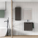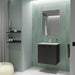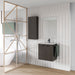 El mueble suspendido mini ANEKO de Amizuva está realizado en tablero de 16 mm lacado antracita brillo y está compuesto por tres elementos: