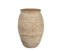 Este jarrón de cerámica evoca las formas clásicas de un ánfora griega, con grabados que aportan textura y personalidad. De estilo mediterráneo, es perfecto para destacar en estanterías o aparadores. Este jarrón es de boca ancha y no es apto para contener agua en su interior.