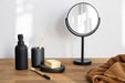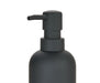 Dosificador para jabón de poliresina negra con válvula negra mate con acabado soft touch.