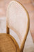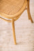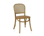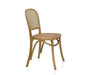 Se trata de una silla de madera de olmo clara, de cuatro patas y rejilla de ratán en el asiento y en el respaldo.