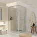 La mampara para plato de ducha de la serie NOEL de Bathme está compuesta por dos hojas fijas y dos puertas correderas, con apertura desde el vértice.