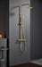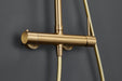 Imex en acabado oro cepillado, barra de ducha extensible, cuerpo de la griferia de latón oro cepillado, rociador extraplano Ø20 y antical, cartucho cerámico de 35mm, incluye flexo PVC y mango.